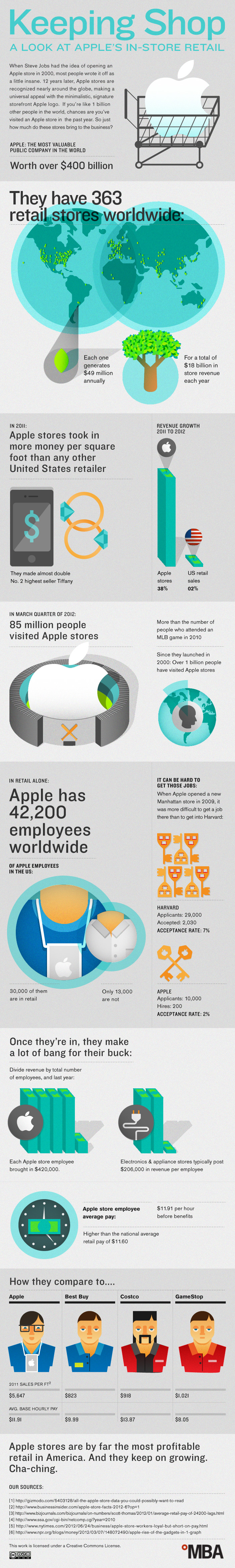 Clearly, Apple is doing something right. According to MBA.com – also the source of the below infographic – “Apple brings in astounding amounts of revenue from all over the globe, and today it’s the most profitable public company in the world.” Although the graphic is a bit dated, it is from 2012, much of the statistics still hold true. However, the one statistic that really stands out from all the rest is related to the retail industry as a whole. From 2011 to 2012, U.S. retail sales, as a whole, grew by 2%. In that same time period, Apple Store’s retail sales grew by 38%. On an individual level, the average consumer electronic retail store posts about $206,000 in revenue per employee. The average Apple Store employee, however, pulls in about $420,000 in revenue. There are many more wild statistics about Apple’s retail business in the below infographic, via OnlineMBA: