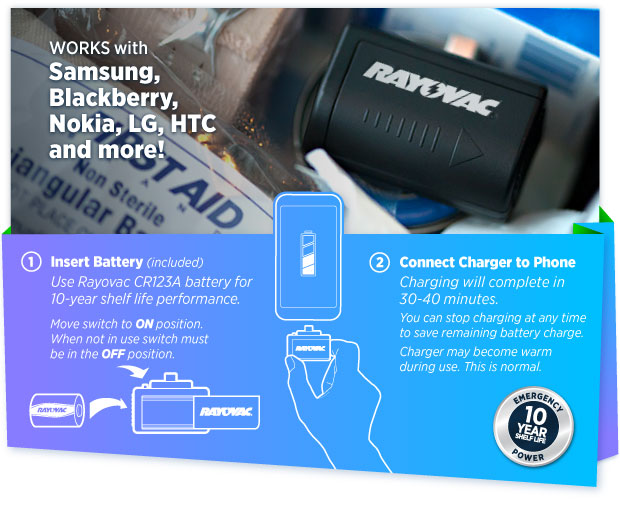 2 Hour Power is a Rayovac portable power charger that runs on one lithium CR123A battery and you can use it to charge Apple 30-pin or Micro USB powered devices, namely mobile phones. Rayovac 2 Hour Power comes in two models: Apple 30-pin and Micro USB.